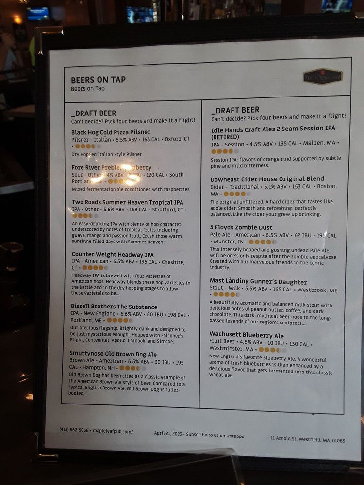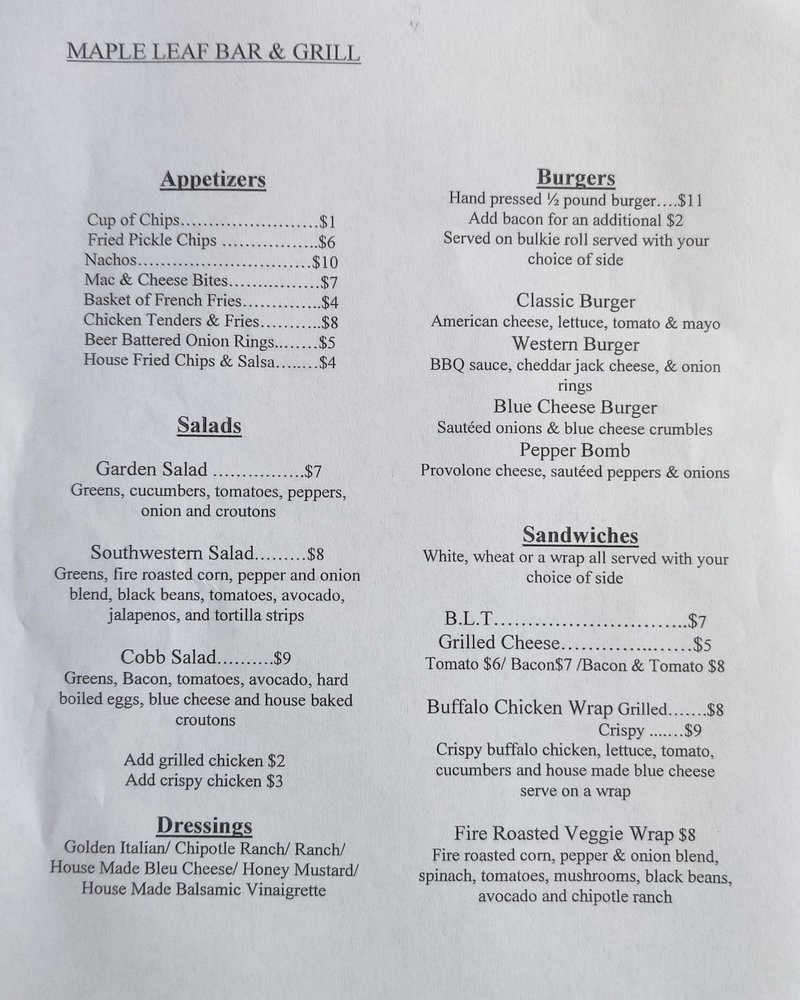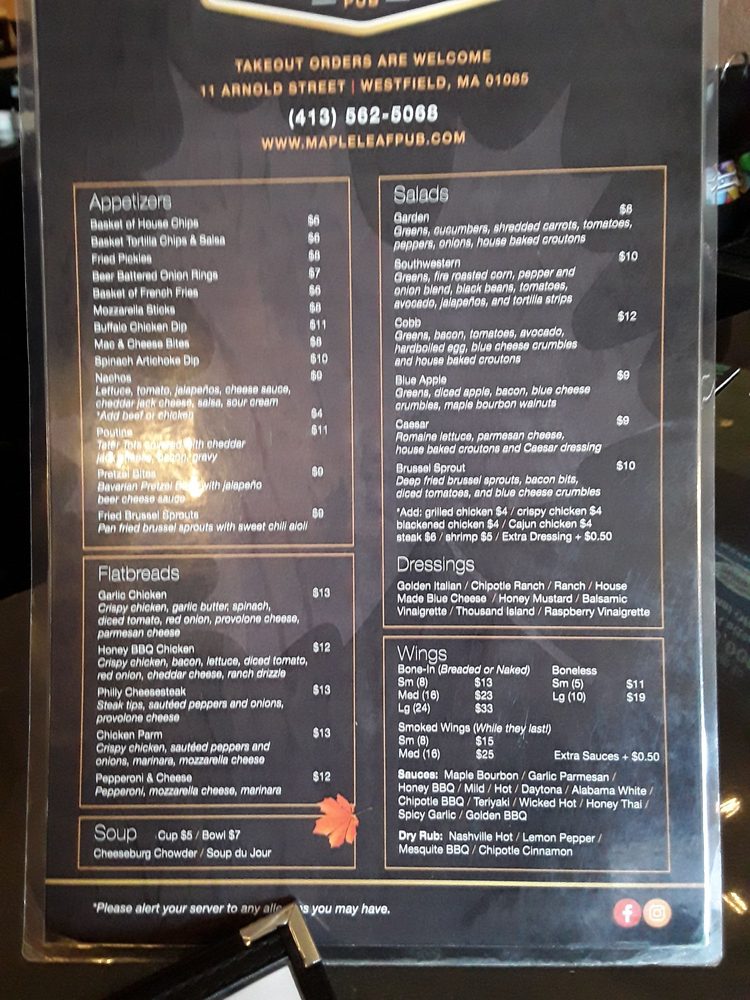 The Maple Leaf Pub Menu